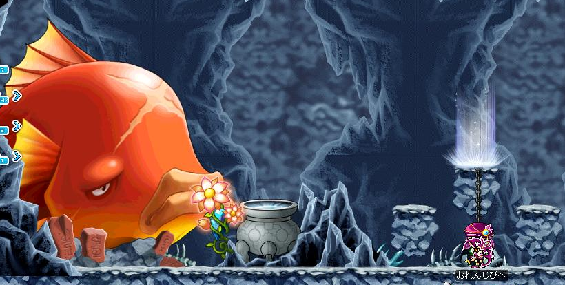 あきらめて他のマップで集め物をしたり報告したりして、今日落ちる前にもう一周だけしてみるかなと巨大魚の洞窟へ入った次の瞬間。