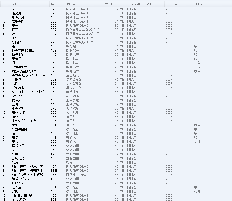 取り込んだついでに「作業用BGM私的陰陽座ベスト」を作ってみたら、3.8時間になりました。