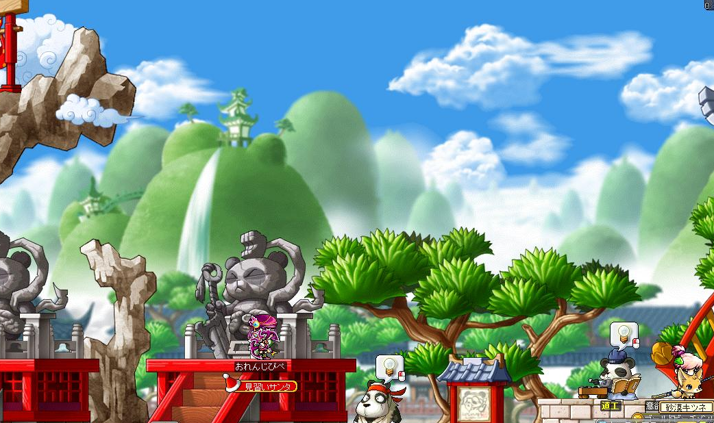 武陵は中国をイメージしてある地方なのだと思うのですが、空や遠景の山が綺麗な場所です。武陵の空は、メイプルの空の中で上位に入る好きな空です。ここの雲は他のマップでもけっこう使いまわされているんですが、この空に浮いてるのが一番好きです。